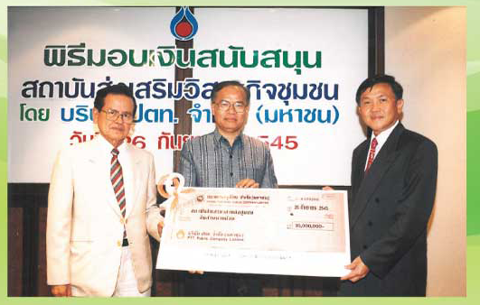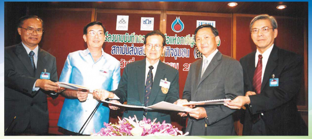 ปี 2545 องค์กรภาคเอกชนและภาคประชาสังคม รวม 4 องค์กร ประกอบด้วย บริษัท ปตท. จํากัด (มหาชน) โดย นายวิเศษ วิบาล กรรมการผู้จัดการใหญ่ มูลนิธิหมู่บ้าน ธนาคารเพื่อการเกษตรและสหกรณ์ การเกษตร (ธ.ก.ส.) และสํานักงานพัฒนาวิทยาศาสตร์และเทคโนโลยีแห่งชาติ (สวทช.) ลงนาม ความร่วมมือในการจัดตั้ง “สถาบันส่งเสริมวิสาหกิจชุมชน” เพื่อทําหน้าที่ประสานความร่วมมือกับ สถาบันการศึกษา ภาคธุรกิจเอกชน และภาคประชาชนในการพัฒนาวิสาหกิจชุมชน ภายใต้ความร่วมมือ ของทั้ง 4 ภาคี โดยแต่ละภาคีมีบทบาทหน้าที่สนับสนุนการดําเนินงานด้านต่าง ๆ อาทิ ธ.ก.ส. สนับสนุนด้านการพัฒนาวิสาหกิจชุมชน สวทช. สนับสนุนด้านการวิจัยและพัฒนา มูลนิธิหมู่บ้าน สนับสนุนด้านบุคลากร ข้อมูลและสื่อ และ ปตท. สนับสนุนด้านการพัฒนาธุรกิจการตลาด รวมทั้ง เป็นองค์กรหลักในการสนับสนุนเงินทุนการดําเนินงานแก่สถาบันส่งเสริมวิสาหกิจชุมชน